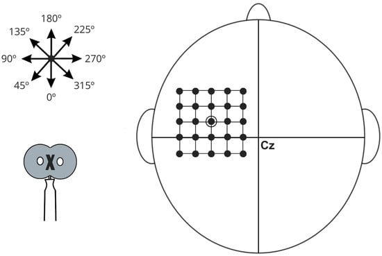 Schematic illustration of diaphragmatic motor cortex stimulation, referenced from point Cz according to the International 10–20 EEG electrode placement system. The diagram features a grid with 1 cm spacing used to identify regions of maximal muscle action potentials. A star symbol indicates various stimulation angles, while an arrow demonstrates the direction of the central current. The stimulation coil is represented at the bottom of the schematic, with an “X” denoting the aligned portion positioned over specific grid locations.
