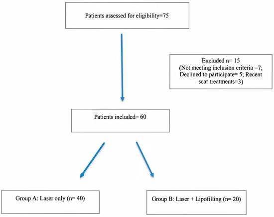 This prospective comparative study involved sixty patients affected by hypertrophic, dyschromic or retractile scars of varying etiology, including post-surgical, post-traumatic and post-burn lesions. The research was conducted between 2021 and 2024 at a single center, following institutional ethical approval and written informed consent from all participants. Patients were divided into two groups (Figure 1). All participants were fully informed about the study procedures and provided written informed consent prior to enrollment. Allocation to the groups was not randomized but based on scar characteristics and patient preference after counseling. Patients with atrophic or adherent scars requiring volumetric correction were treated with combined hybrid fractional laser and lipofilling, while patients with more superficial scars or who declined fat grafting underwent laser treatment alone: