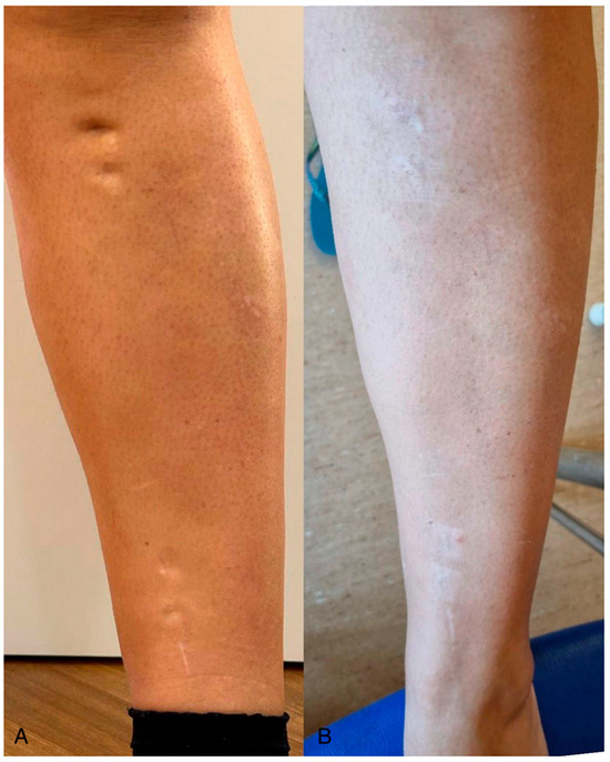 A 43-year-old female patient with a traumatic scar on the right calf. (A) Pre-treatment image reveals skin irregularities. (B) Post-treatment image (3 months after laser and lipofilling) demonstrates substantial improvement in skin tone uniformity and scar integration with surrounding tissue.