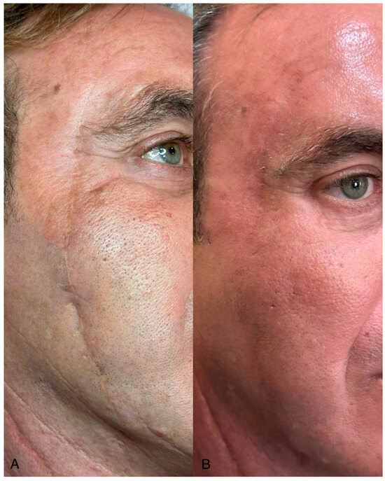A 57-year-old male patient with a visible scar. (A) The image shows the scar before treatment. (B) The image displays the scar three months after combined hybrid fractional CO2 laser and autologous lipofilling, showing marked improvement in skin texture, pigmentation, and scar thickness.