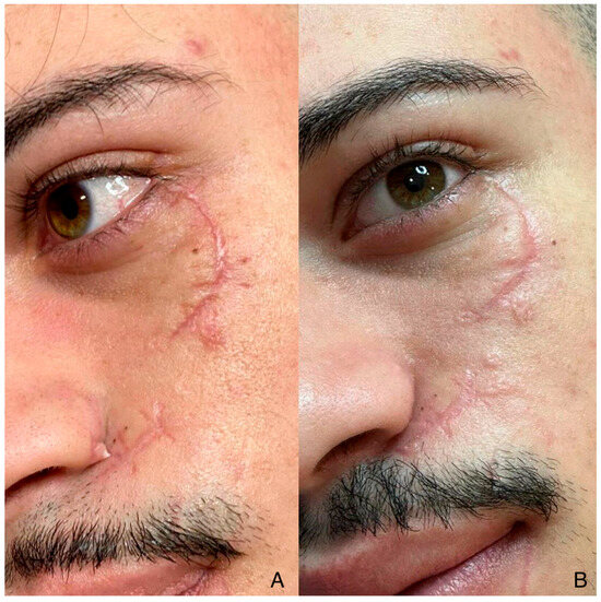 A 25-year-old male patient presented with a curved, hypertrophic post-traumatic scar extending from the infraorbital region to the mid-cheek. (A) The image shows the scar before treatment. (B) The image, taken 3 months after fractional CO2 laser therapy alone, demonstrates improved scar flattening, decreased erythema, and more regular skin texture, although some residual irregularities remain visible.