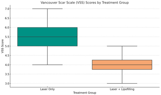 VSS Scores: Although the mean VSS score was lower in the Laser + Lipofilling group, indicating improved scar quality, the difference did not reach statistical significance (p = 0.394). As illustrated in Figure 5, patients in the Laser Only group exhibited higher median VSS values and a broader interquartile range, suggesting more severe and variable scarring. In contrast, the combined group showed narrower distribution and lower maximum values, reflecting more consistent and favorable clinical outcomes. These results support the potential regenerative effect of adipose-derived stromal components in enhancing scar remodeling.