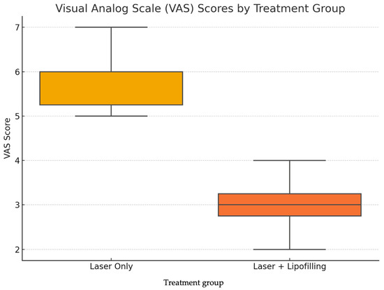 Boxplot of Visual analog scale (VAS) scores comparing “Laser Only” and “Laser + Lipofilling” treatment groups. Graphical comparisons (Figure 4 and Figure 5) illustrate the distribution of VSS and VAS scores using boxplots. These figures show a narrower interquartile range and lower maximum values in the Laser + Lipofilling group, indicating more uniform and consistent improvement across patients. These findings support the hypothesis that the regenerative effects of adipose-derived stem cells (ADSCs) and stromal vascular fraction (SVF) enhance the efficacy of fractional laser therapy.