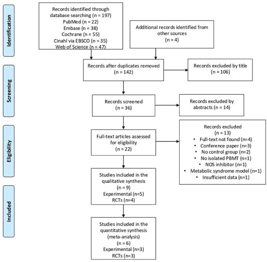 The database search identified a total of 197 articles. Considering the eligibility criteria, four randomized controlled trials (RCTs) and five experimental studies were finally included in this review (Figure 1). Supplementary File S2 contains articles excluded in the abstract, full-text analysis, and the reasons for exclusions.