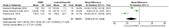 All included studies measured systolic blood pressure in millimeters of mercury (mmHg). One study assessed BP by a sphygmomanometer [17], another by a digital upper-arm BP monitor [29], another described that BP was measured using the indirect oscillometer method [15], and the last one measured BP by a manual BP monitor [28]. One study compared laser acupuncture plus Captopril-25 mg (ACE inhibitor) to Captopril-25 mg twice daily only (without laser) for 6 weeks and found that laser acupuncture significantly decreased SBP, compared to the antihypertensive alone [17]. Another study compared 4 weeks of laser acupuncture to a control group (no intervention or drugs) and found reduced SBP correlated with laser acupuncture treatments [29]. Two studies compared laser acupuncture to sham therapy. One of these studies carried out 6 weeks of therapy in patients who used drugs for hypertension for at least one year [15]. The other study performed 12 weeks of therapy in patients who did not use a drug for hypertension [28]. Both studies found reduced SBP in the laser acupuncture group. However, post-intervention comparisons between groups were not performed in these two studies. The meta-analysis result, including three studies (n = 169), showed that when compared to control, sham therapy, or antihypertensive drugs, the PBM treatments had a reduction in SBP with a mean difference of −15.87 mmHg (confidence interval = −27.11 to −4.64 mmHg; p = 0.006; Figure 2), with very low-certainty evidence and considerable heterogeneity (I2 = 92%).