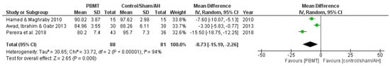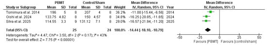 The meta-analysis result, including three studies (n = 49), showed that when compared to control or sham therapy, PBM treatments had a reduction in SBP with a mean difference of −14.44 mmHg (confidence interval = −18.10 to −10.79 mmHg; p < 0.00001; Figure 4), with very low-certainty evidence and moderate heterogeneity (I2 = 43%). Sensitivity analysis of this outcome based on the wavelength showed that the exclusion of Tomimura et al. [10], the only study that used an infrared wavelength, reduced heterogeneity to 0%, while the direction of the effect size remained the same.