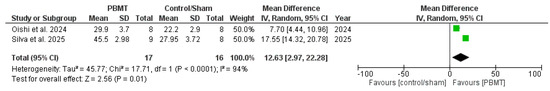 The meta-analysis results, including two studies (n = 33), showed that when compared to control or sham therapy, PBM treatments induced an increase in NOx with a mean difference of 12.63 μM (confidence interval = 2.97 to 22.28 μM; p = 0.01; Figure 5), with very low-certainty evidence and considerable heterogeneity (I2 = 94%).