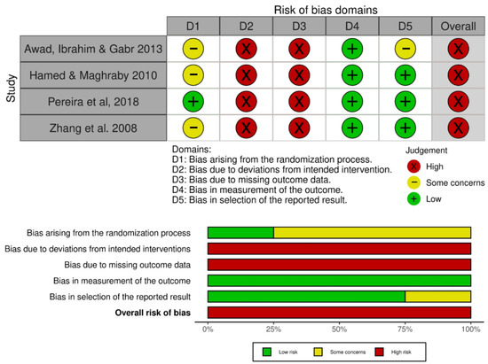 Risk of bias for RCTs assessed by RoB 2 resulted in an overall high risk of bias for all included studies (Figure 6). The most concerning domains were bias due to deviations from intended intervention and bias due to missing outcome data. Methodological quality scores for RCTs assessed by the PEDro scale ranged from 4 to 7 in a scale from 0 to 10. One study had four points [29], two had five points [17,28], and one had seven points [15]. The main reasons for losing points were lack of concealed allocation, blinding of therapists, blinding of assessors, sample loss, and intention to treat analysis. The PEDro scale assessment can be found in the Supplementary File S3.
