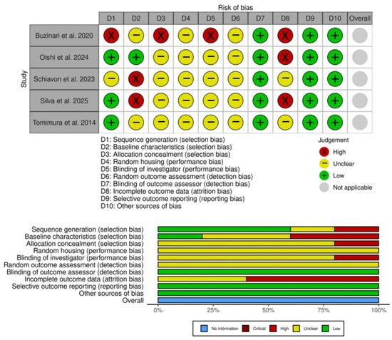 Assessment of risk of bias of experimental studies using the SYRCLE tool. The table on top represents the judgment for each study across ten domains: D1, sequence generation (selection bias); D2, baseline characteristics (selection bias); D3, allocation concealment (selection bias); D4, random housing (performance bias); D5, blinding of investigator (performance bias); D6, random outcome assessment (detection bias); D7, blinding of outcome assessor (detection bias); D8, incomplete outcome data (attrition bias); D9, selective outcome reporting (reporting bias); and D10, other sources of bias. Judgments are represented by round symbols: green (low risk), yellow (unclear), red (high risk), and gray (not applicable). The summary plot (bottom) shows the proportion of studies rated as low risk, unclear, high risk, or not applicable for each domain [7,8,10,30,31].