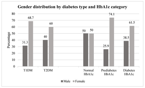 Figure 1 illustrates the gender distribution across diabetes type and HbA1c categories. Among participants with type 1 diabetes, 31.3% were male, and 68.7% were female; for type 2 diabetes, 40.0% were male, and 60.0% were female. Normal HbA1c was 50.0% in males versus 50.0% in females, prediabetes HbA1c was 25.9% in males versus 74.1% in females, and diabetes HbA1c was 38.5% in males versus 61.5% in females. Chi-square tests showed no significant differences by gender for diabetes type (p = 0.087) or HbA1c category (p = 0.124).
