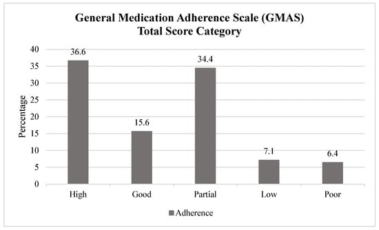 General Medication Adherence Scale (GMAS)—total score category (N = 424). GMAS categories: high (30–33), good (27–29), partial (17–26), low (11–16), or poor (10 or below).
