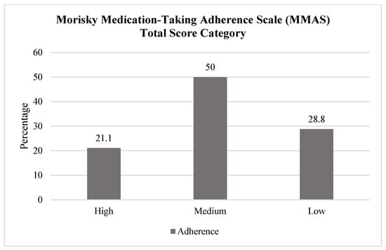 Morisky Medication-Taking Adherence Scale (MMAS)—total score category (N = 424). MMAS categories: high (0), good (27–29), medium (1–2), or low (3–4).