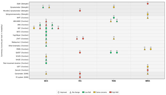 | [44] | TENS | 9HPT ⇧; QUEST (grasp) ⇧; ABILHAND → | TENS + SM-TOT + CIMT | Sham TENS + SM-TOT + CIMT | 100 · 200 · until the subject felt the initial current sensation | 60, 3/wk × 8 wk | — |