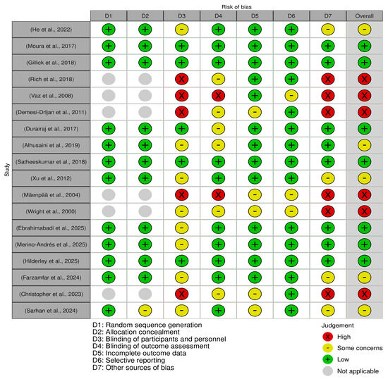 | Incomplete outcome data | Low | Low | Low | Low | Low | Some | Low | Low | Low | Low | Some | Some | Low | Low | Low | Low | Some | Some |