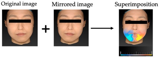 Process of volumetric asymmetry assessment using 3D stereophotogrammetry. The original 3D facial surface was mirrored across the constructed midsagittal plane, and the mirrored surface was superimposed on the original using a best-fit algorithm. The absolute volumetric difference between the original and mirrored surfaces was calculated for each region of interest.
