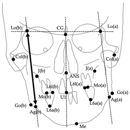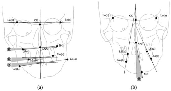 The images were digitized and analyzed using WinCeph ver. 11.0 (Rise Co., Ltd., Sendai, Japan). Twenty-eight cephalometric measurements were performed based on anatomical landmarks and reference planes commonly used in previous studies [8,29,37,38,39]. The midsagittal reference line was defined by connecting the crista galli and the maxillary incisor midpoint (U1), following established PA cephalometric protocols for facial asymmetry assessment [38,39]. This approach has been widely adopted to ensure consistency across studies; however, it should be noted that in cases with inherent maxillary skeletal asymmetry, the use of U1 as a reference point may partially mask discrepancies between skeletal and soft tissue midfacial structures. The selected variables included linear and angular parameters describing transverse skeletal relationships, mandibular deviation, maxillary cant, and asymmetry indices. Landmarks, definitions, and measurement methods are summarized in Table 1, and representative examples are illustrated in Figure 2, Figure 3 and Figure 4. Figure 2 shows the landmarks used for PA cephalometric analysis (a: deviated side, b: contralateral side). Figure 3a–c present the linear measurement items on PA cephalograms, and Figure 4a,b depict the angular measurement items. The choice of these 28 parameters was guided by established cephalometric protocols for facial asymmetry assessment, ensuring consistency with earlier research while enabling detailed quantitative evaluation of skeletal morphology relevant to soft tissue asymmetry.