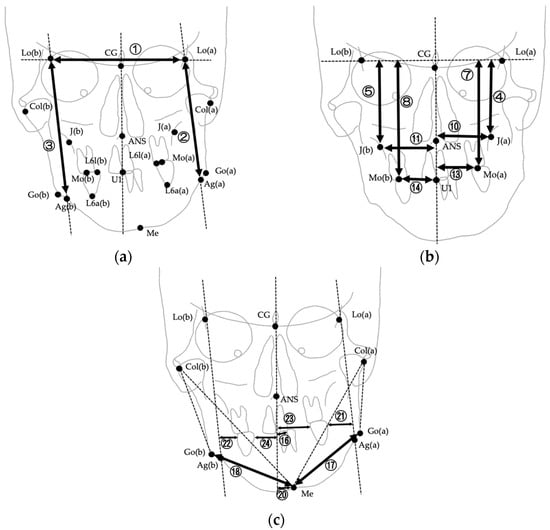 Linear measurements used in PA cephalometric analysis. Numbers correspond to the measurement items listed in Table 1. (a) Measurements ①–③ (Lo line, FP(a), FP(b)); (b) Measurements ④–⑭ (Lo line–J, Lo line–Mo, Midline–J, Midline–Mo, and related measurements except for differences); (c) Measurements ⑯–㉔ (Midline–U1, Go–Me, Midline–Me, and upper first molar to FP and midline). Please note that difference measurements (⑥, ⑨, ⑫, ⑮, ⑲) are defined in Table 1 but not illustrated in this figure.