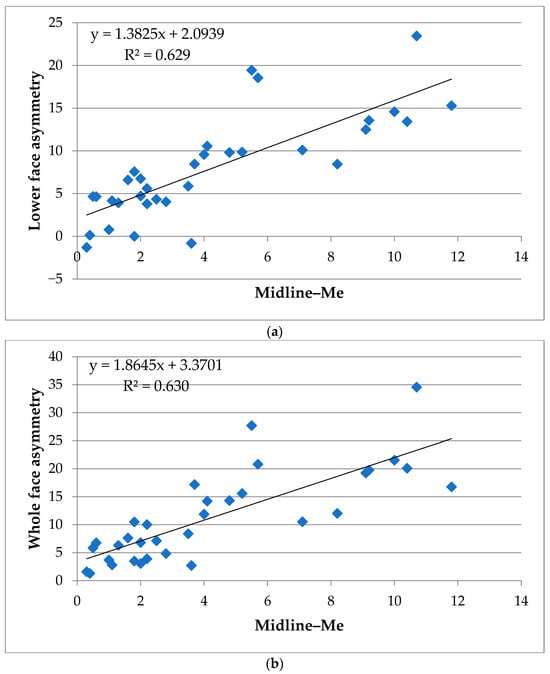 Scatter plots of skeletal and soft tissue asymmetry in the lower and whole face. (a) Correlation between lower facial soft tissue asymmetry volume and deviation of the menton from the midline (Midline–Me). (b) Correlation between whole facial soft tissue asymmetry volume and deviation of the menton from the midline (Midline–Me). Linear regression lines and coefficients of determination (R2) are displayed in each panel. Both plots highlight the strong association between menton deviation and volumetric soft tissue asymmetry in the lower and whole face regions.