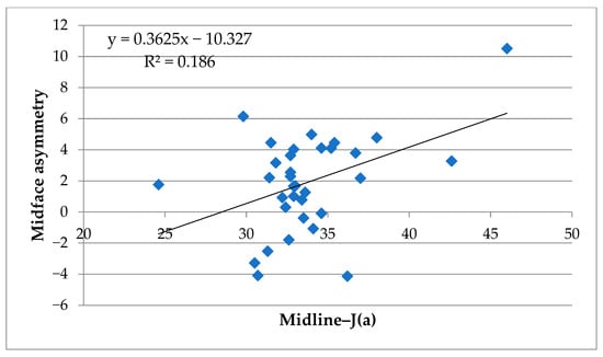 Scatter plot of skeletal and soft tissue asymmetry in the midface. Correlation between midfacial soft tissue asymmetry volume and deviation of J(a) from the midline (Midline–J(a)). The regression line and coefficient of determination (R2) are displayed.