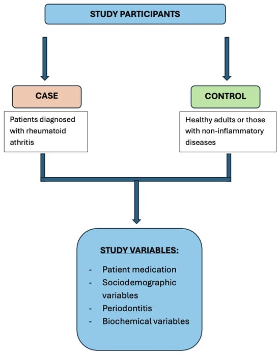 An observational case–control study was carried out between July 2024 and February 2025. The case group consisted of patients diagnosed with RA, while the control group included healthy individuals or patients with non-inflammatory degenerative joint conditions. Participants were recruited from the Rheumatology Department of the San Cecilio University Clinical Hospital (Granada, Spain). Inclusion criteria for the RA group were adult patients with a confirmed diagnosis of RA based on the criteria of the American College of Rheumatology (ACR) []. Controls were healthy adults or individuals with non-inflammatory musculoskeletal conditions from the same clinical setting. Exclusion criteria for both groups included having received periodontal treatment within the past year, being edentulous or having fewer than 10 teeth, presenting with any systemic inflammatory condition other than those under study, immunodeficiency disorders, or pregnancy. In addition, control participants who had taken antibiotics and/or anti-inflammatory medications within the previous two months were excluded.