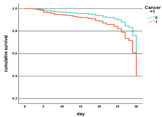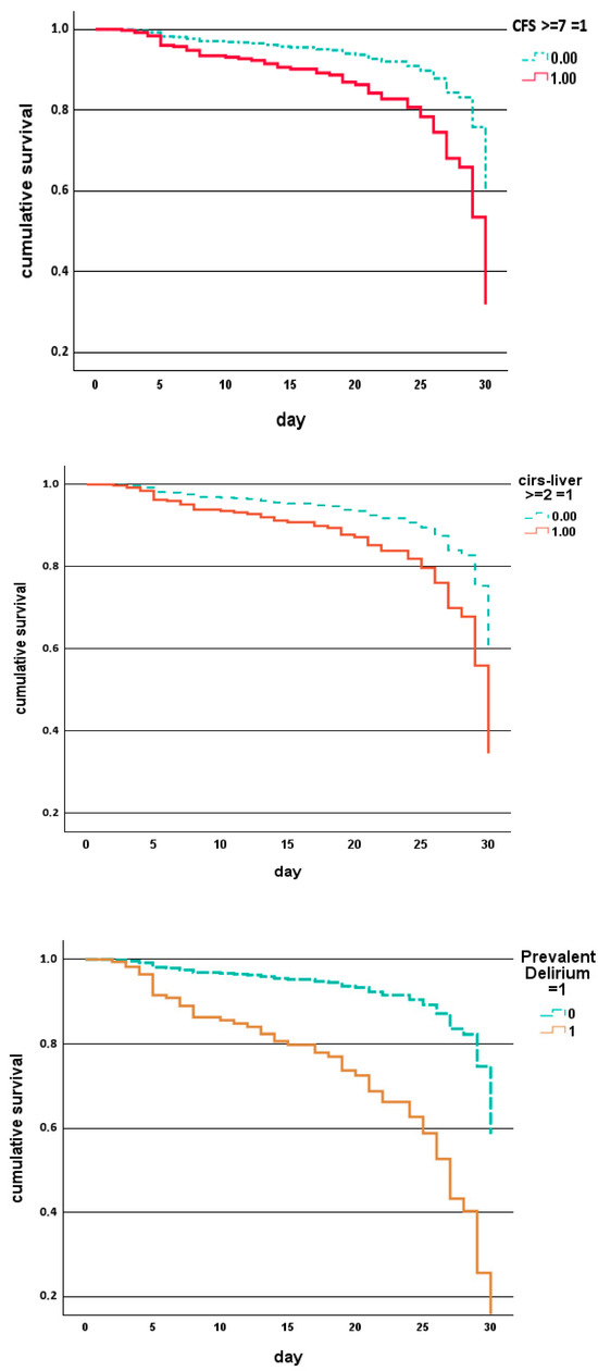 In multivariable Cox regression (Table 5), independent predictors of in-hospital mortality included prevalent delirium (HR 4.66, 95% CI 2.42–8.96, p < 0.001), severe frailty (CFS ≥ 7) (HR 2.26, 95% CI 1.32–3.87, p = 0.003), CIRS-LIVER ≥ 2 (HR 2.05, 95% CI 1.18–3.56, p = 0.010), and cancer (HR 1.83, 95% CI 1.07–3.14, p = 0.026).