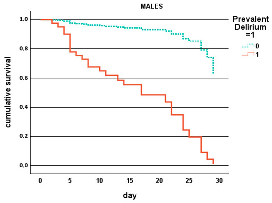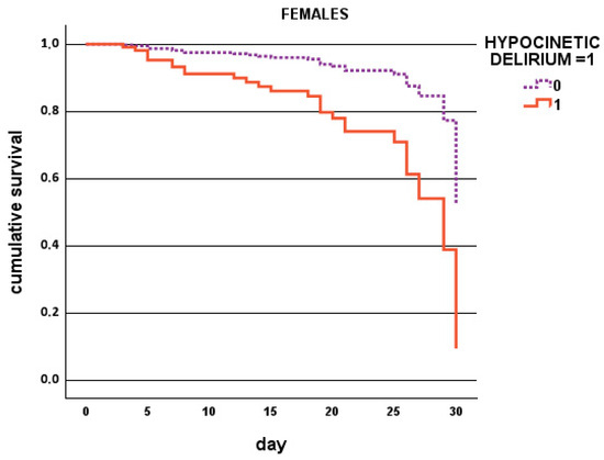 Cumulative survival (Cox regression) in male patients with/without prevalent delirium and in female patients with/without hypokinetic delirium (Table 6).