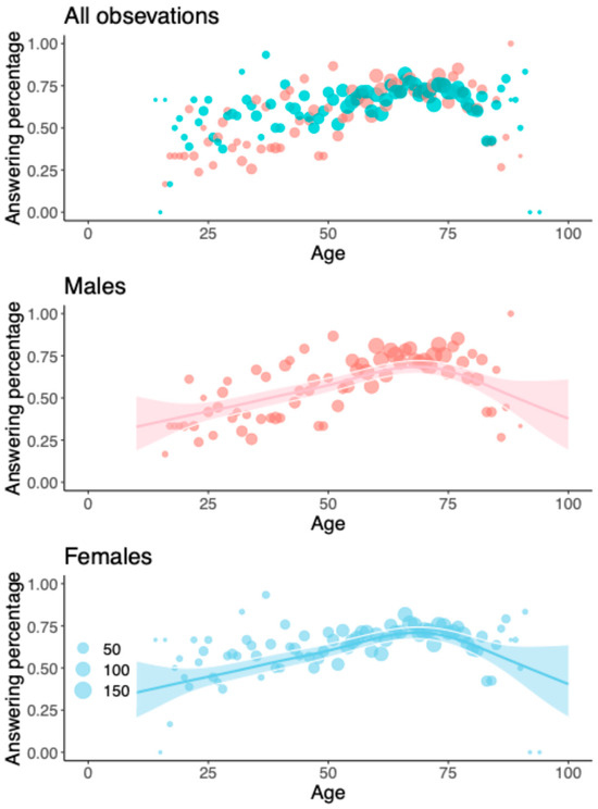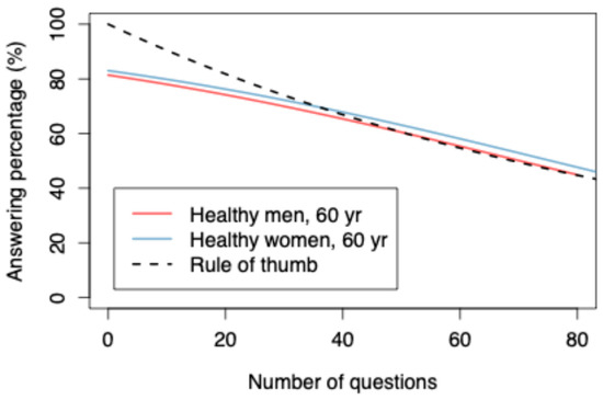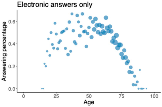 Age was significantly statistically associated with the response rate (p < 0.001); for patients up to 75 years old, the response rate increased, and after this, a decrease was observed (Figure 2). When only the online electronic responses were assessed, the highest response rate was found among 59-year-old patients at 61.4% (Figure 3). For a healthy (ASA class = 1) 60-year-old patient, a 60% response rate was achieved, with 50.8 questions. Sex, ASA class, and occupational status had no statistically significant relation to the response rate. Smoking was associated with a poorer response rate (−0.395, p = 0.002). (See Supplementary S2).