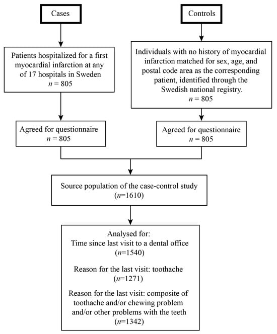 The PAROKRANK case–control study has been presented previously [7]. In 2010 until 2014, a total of 805 patients hospitalized for a first MI were recruited from 17 Swedish hospitals. Diagnosis of MI was achieved according to international criteria as issued during the study period [9]. Controls matched for sex, age (±3 months), and postal code area were randomly selected from the national population registry. To be eligible for inclusion, controls were to be free from previous MI and heart valve replacement. At the local departments of cardiology and hospital dentistry, patients were scheduled for outpatient visits approximately 6–10 weeks after the acute event, and controls were contacted within ten days. Physical examination and blood sampling was performed, and medical and family history information was collected using standardized questionnaires. A survey comprising a wide range of questions, among them some that concerned oral habits and dental service use, was responded to by all participants. A flow chart of the study is presented in Figure 1.