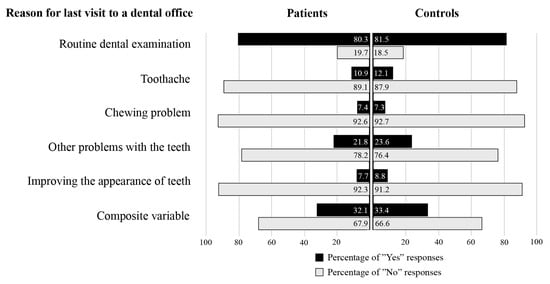 The alternatives for reason for the last visit to a dental office and the responses given by the patients and the controls, respectively. Composite variable is a “Yes” response to toothache and/or chewing problem and/or other problems with the teeth.