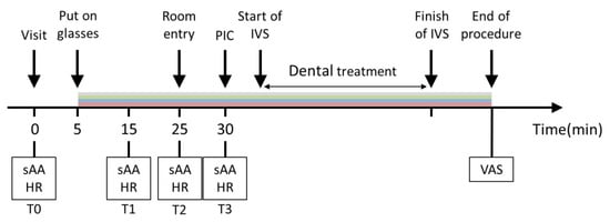 Study protocol and time points for measurement. sAA: salivary alpha-amylase, HR: heart rate, PIC: peripheral intravenous cannulation, VAS: visual analog scale, IVS: intravenous sedation. T0: Upon being seated in the waiting room, T1: 10 min after wearing the goggles, T2: Immediately after entering the treatment room, T3: Just before PIC.