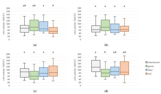 At T3, a significant difference in sAA activity was observed among the visual color conditions. The median (IQR) sAA values were 80.0 (61.3–100.5) kIU/L for the green condition, 88.5 (67.5–112.8) kIU/L for blue, 88.5 (70.3–149.3) kIU/L for red, and 117.0 (90.8–160.3) kIU/L for the translucent condition. Post hoc pairwise comparisons indicated that the green condition produced significantly lower sAA activity than the translucent condition (p = 0.009). Although the blue condition exhibited a trend toward lower values compared to the translucent condition, this did not reach statistical significance. No significant differences were found among the green, blue, and red conditions (Figure 3).