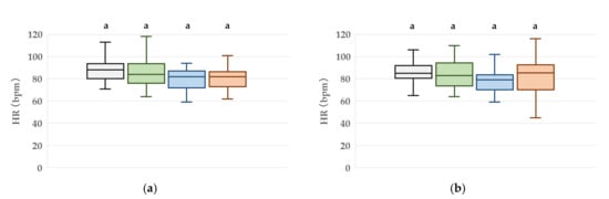 Box plots of heart rate (HR) at four time points: (a) T0 (baseline in the waiting room), (b) T1 (10 min after goggle application), (c) T2 (immediately after entering the treatment room), (d) T3 (just before peripheral intravenous cannulation). Boxes represent the interquartile range (IQR), the horizontal line within each box indicates the median, and the whiskers show the minimum and maximum values. Different letters denote statistically significant differences between groups (p < 0.05, n = 20).