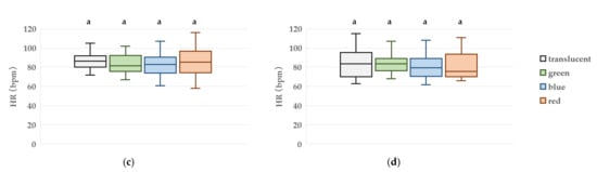 At T3, the median HR was 83.5 (76.8–89.0) bpm for the green condition, 79.5 (71.5–89.0) bpm for blue, 75.5 (70.8–93.3) bpm for red, and 83.5 (72.8–94.5) bpm for the translucent condition. No statistically significant differences in HR were observed among the four conditions (Figure 4).