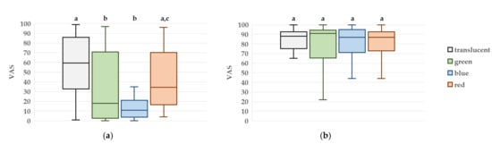 The median VAS scores for overall treatment satisfaction were 91.0 (69.8–93.5) for the green condition, 87.0 (73.8–95.0) for blue, 87.0 (74.3–92.3) for red, and 88.0 (77.0–92.3) for the translucent condition. No statistically significant differences were observed among the four conditions (Figure 5).