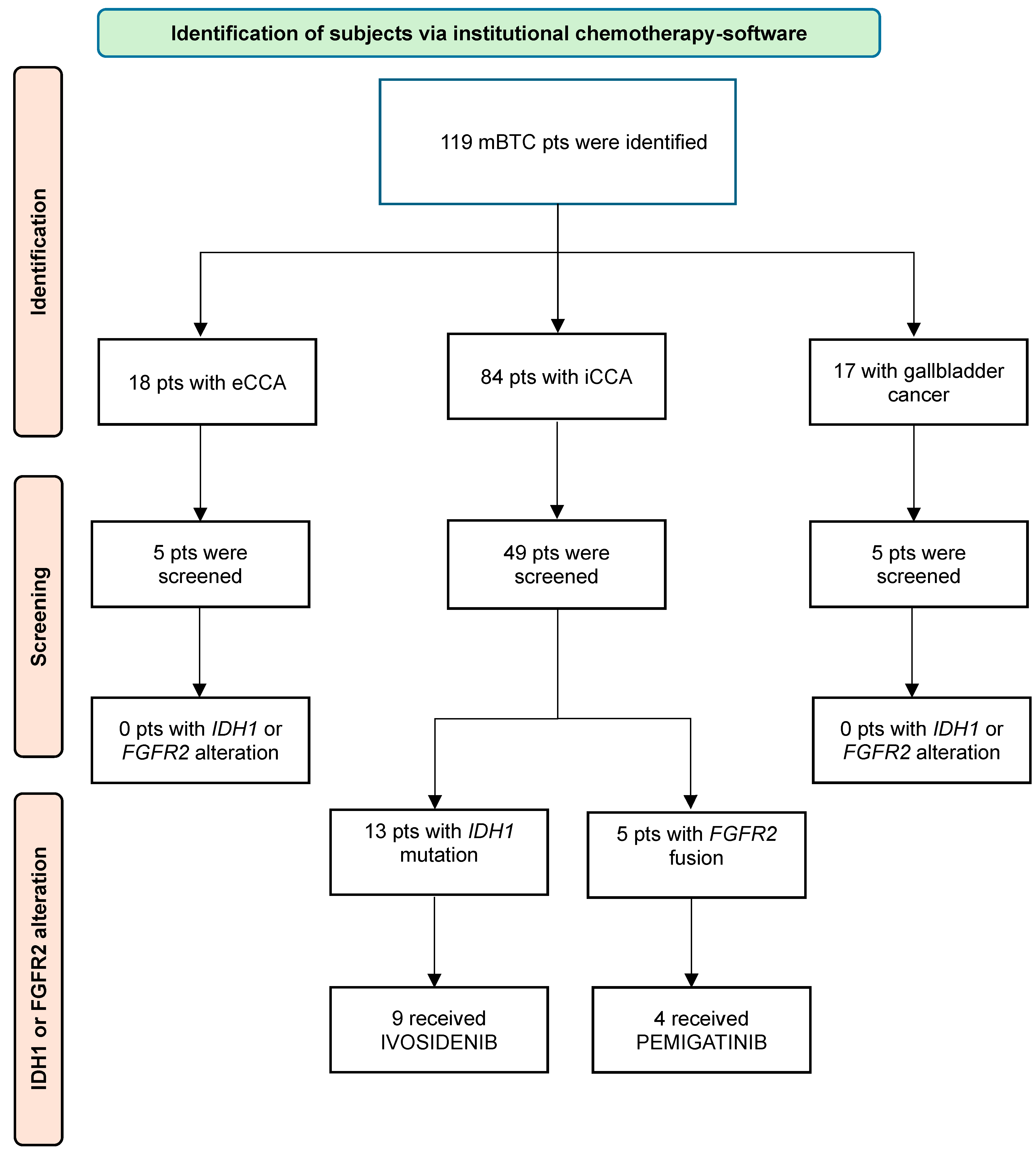 - Kendre, G.; Murugesan, K.; Brummer, T.; Segatto, O.; Saborowski, A.; Vogel, A. Charting co-mutation patterns associated with actionable drivers in intrahepatic cholangiocarcinoma. J. Hepatol. 2023, 78, 614–626. [Google Scholar] [CrossRef]