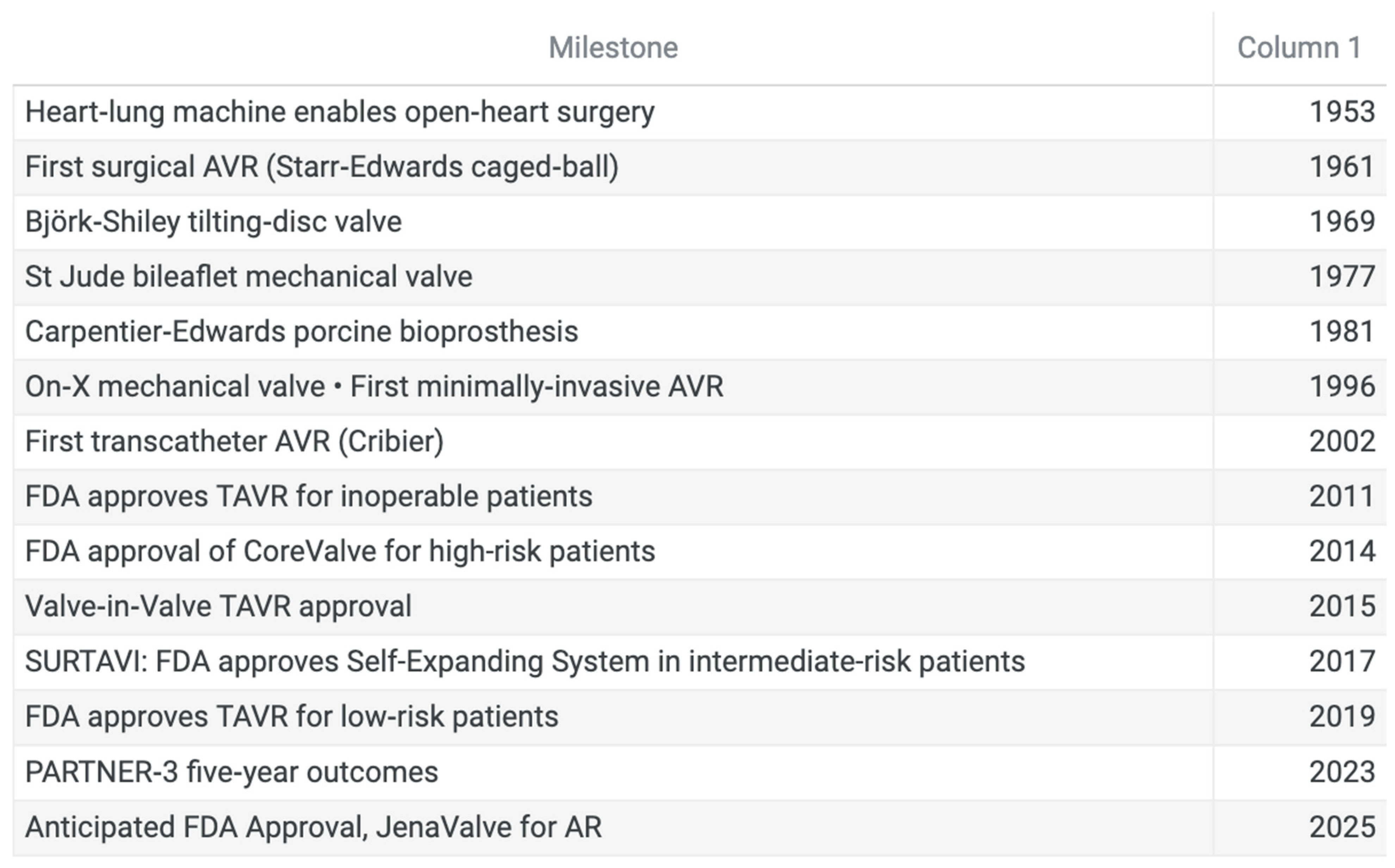 The evolution of aortic valve replacement over the past several decades illustrates the rapid advancements in cardiovascular surgery and interventional cardiology. From the introduction of the Starr-Edwards valve in 1961 to the recent and transformative adoption of transcatheter aortic valve replacement, AVR development has expanded options for patients with aortic valve disease.
