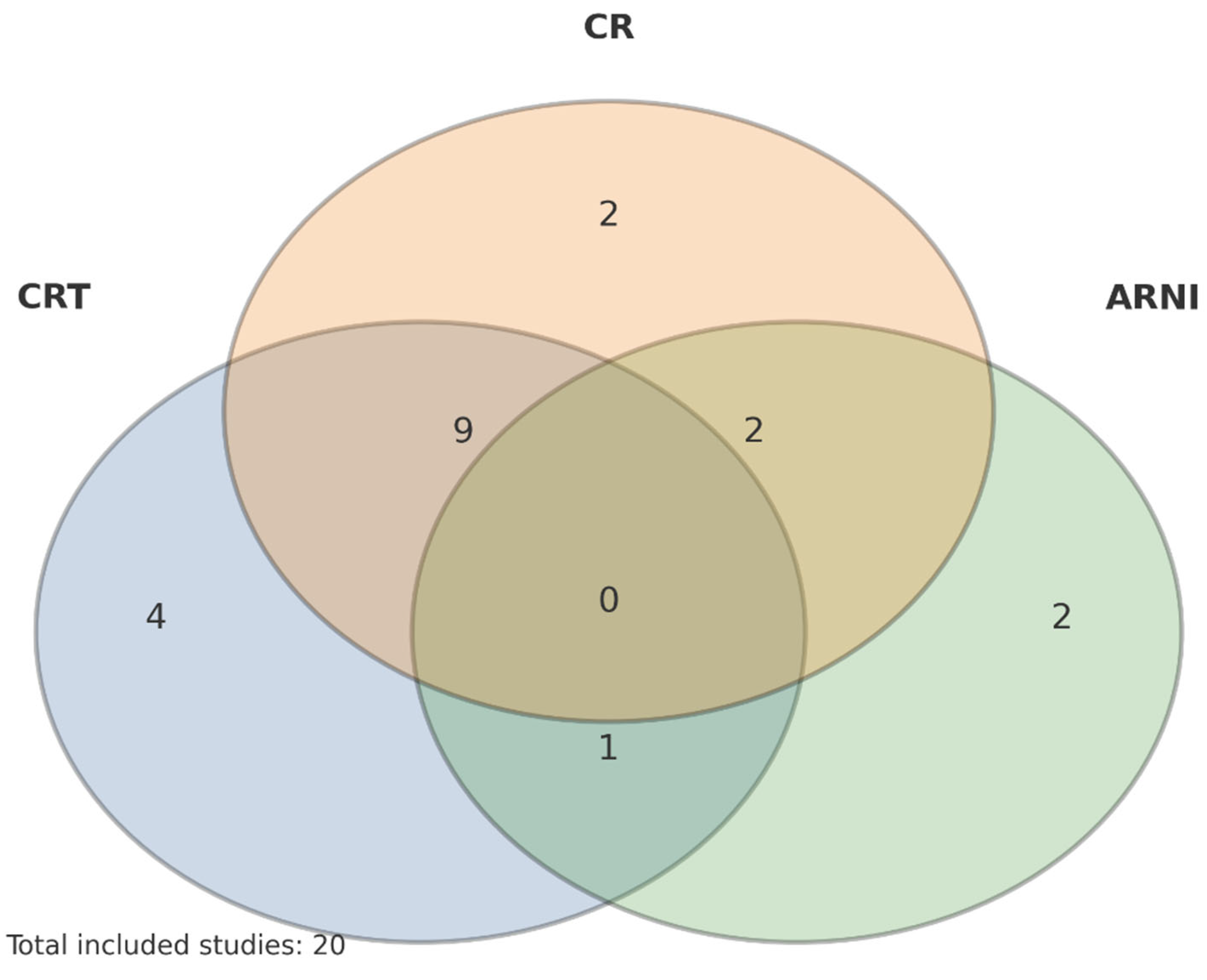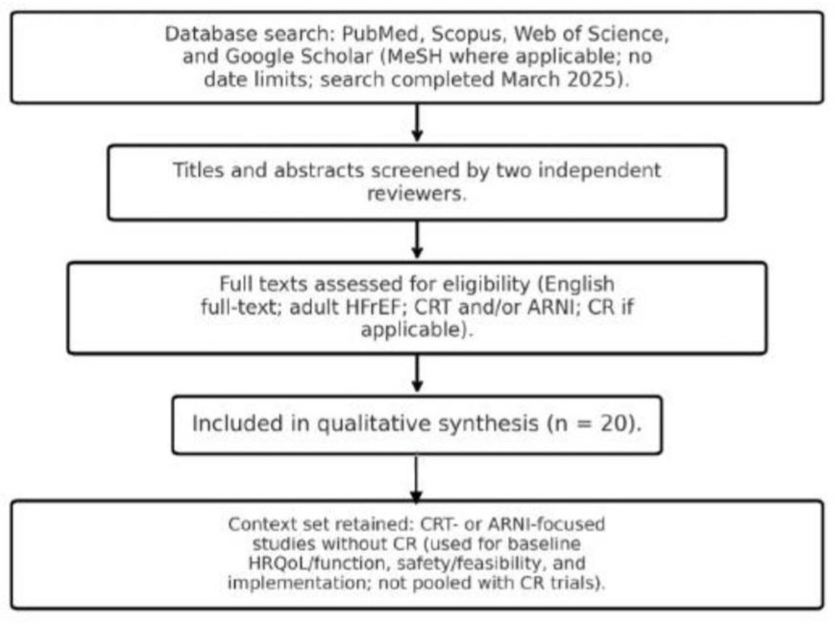 A total of 20 full-text peer-reviewed studies were included. Designs spanned randomized and nonrandomized trials, single and multicenter cohorts, registry analyses, systematic and network meta-analyses, and clinical/practice reviews. Collectively, they evaluated CR, CRT, and/or ARNI therapy in modern HFrEF care. Although most studies supported favorable effects of CR on functional capacity and health status, no study in this set prospectively tested CR in a cohort simultaneously on CRT and ARNI as a predefined population—an important evidence gap [