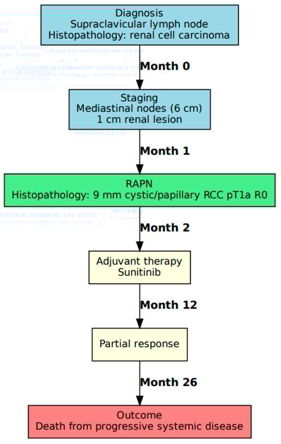 A 35-year-old female presented with left supraclavicular lymph node enlargement. An excisional biopsy performed in an outside hospital revealed a metastatic RCC. Staging CT scan and MRI showed multiple enlarged mediastinic lymph nodes (the largest of which measured 6 cm), and a 1 cm area with altered density at the lower pole of the left kidney. Due to its medial position, the mass was unsuitable for a percutaneous biopsy. After a multidisciplinary consultation, the patient underwent a transperitoneal robotic-assisted partial nephrectomy (RAPN) of a 1 cm intrarenal solid mass with intraoperative ultrasound guidance to confirm the renal origin of the malignancy. The postoperative course was uneventful. Histopathology confirmed a 9 mm cystic and papillary RCC with negative margins. The patient underwent adjuvant therapy with sunitinib with a transient partial response at 12 months and died at 26 months postoperatively with progressive systemic disease (Figure 1).