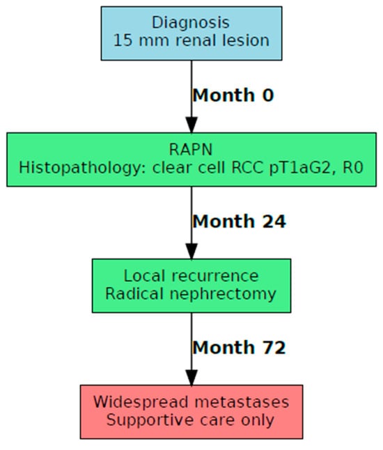 A 75-year-old woman, with an incidental left renal mass of 15 mm and no significant comorbidities or previous surgical procedures in her clinical history, underwent a transperitoneal RAPN with intraoperative ultrasound guidance. Final histopathology demonstrated a pT1a, grade 2, clear cell renal carcinoma with negative margins. Two years later, local recurrence occurred and was treated with radical nephrectomy. Six years after the first procedure, widespread metastatic disease developed and was managed with best supportive care (Figure 2).