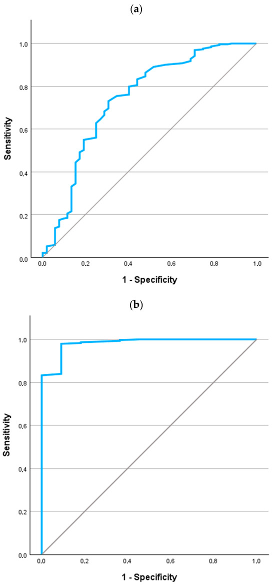 The ROC curve for a diagnosis of AATD in CF is referenced in Figure 2. For the entire population (Figure 2a), the area under the curve was 0.740 (p < 0.001; 95% confidence interval 0.658 to 0.823). For the detection of any AAT mutation, the best cutoff value was 129 mg/dL. This reported a sensitivity of 73.0% (95% confidence interval 68.4% to 77.7%) and specificity of 69.2% (95% confidence interval 64.4% to 74.1%).