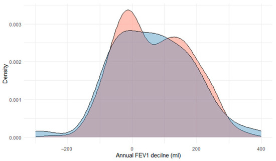 Density plot of annual FEV1 decline in those cases carrying an AAT mutation (red; n = 58) and those without (blue; n = 311).
