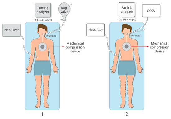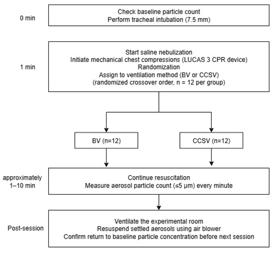 This was a manikin-based simulation study, conducted using a randomized crossover design (Figure 1). A Resusci Anne First Aid Full Body TrolleySuit (Laerdal, Stavanger, Norway) was modified with the Resusci Anne Airway Head Upgrade Kit to enable both chest compressions and endotracheal intubation. Before each trial, the manikin was intubated with a 7.5 mm endotracheal tube. Mechanical chest compressions were continuously delivered using a LUCAS 3 CPR device (Stryker, Kalamazoo, MI, USA) for 10 min per trial, at a rate of 102 ± 2/min and a depth of 53 ± 2 mm. These settings were consistent with the default device settings and international resuscitation guidelines. Manual BVs were performed using a self-inflating resuscitation bag (Ambu® SPUR® II, adult size, Ambu A/S, Copenhagen, Denmark) equipped with a pressure-limiting valve and a resuscitator volume of approximately 1547 mL. BVs were delivered approximately every 6 s, corresponding to a 10:1 compression-to-ventilation ratio. Each breath was delivered over approximately 1 s, to achieve visible chest wall expansion of the manikin without excessive airway pressure. To prevent hyperventilation, only one-third of the bag volume was compressed for each breath. All BVs were performed by individuals who were trained to follow a standardized protocol, ensuring consistency within and across resuscitation sessions. For CCSV, a MEDUMAT Standard2 ventilator (Weinmann Emergency Medical Technology GmbH + Co. KG, Hamburg, Germany) was used. Ventilator parameters were set to a peak inspiratory pressure of 60 cm H2O, inspiratory time of 205 ms, and fraction of inspired oxygen of 1.0. The synchronization algorithm of CCSV inherently minimized conflicts between compressions and ventilations, whereas manual BV was performed during ongoing compressions to reflect common clinical practice and avoid interruptions in perfusion. Importantly, no high-efficiency particulate air (HEPA) filters were used in either the BV or ventilator circuits, as the simulations were designed to model a worst-case scenario and directly compare aerosol generation between the two methods without the confounding effect of filtration.