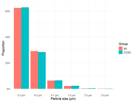 The aerosol particle size distribution for both ventilation methods is presented in Figure 3. In each group, particles measuring 0.3 μm in diameter predominated, accounting for more than 60% of the total aerosol particle count, followed by particles of 0.5 μm and 0.7 μm diameter. The overall particle size distributions were similar between the groups.