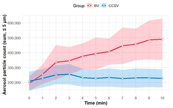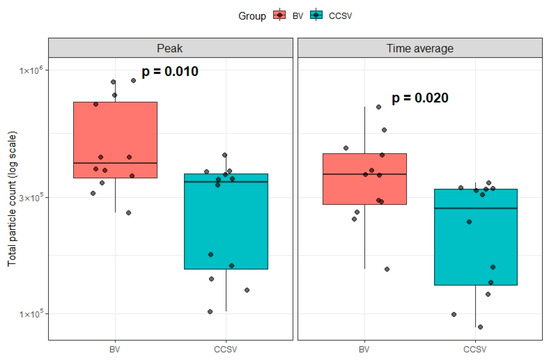 Furthermore, on the log scale, both peak aerosol particle counts (p = 0.010) and log-scaled time-averaged aerosol particle counts (p = 0.020) were significantly lower in the CCSV group than in the BV group (Figure 5).