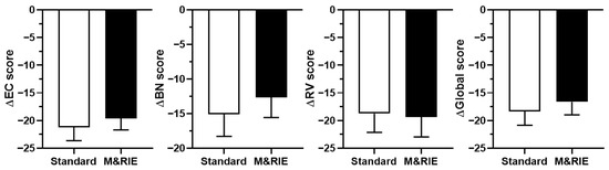 Abbreviated Profile of Hearing Aid Benefit (APHAB) Scores for standard and M&RIE receivers. This figure shows APHAB results from 39 participants, assessing subjective satisfaction across four subscales: Ease of Communication (EC), Background Noise (BN), Reverberation (RV), and Global score. No significant differences were observed between the standard and M&RIE receivers in any subscale (p > 0.05, paired t-test). The M&RIE receiver showed slight, non-significant trends toward improved performance in EC and BN.
