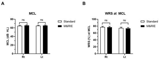 Comparison of most comfortable listening Level (MCL) and word recognition score (WRS) between standard and M&RIE receivers. (A) MCL reported by participants when using the standard and M&RIE receivers (n = 39 ears at each group). No significant differences were observed, indicating similar comfort across devices. (B) WRS assessed at each participant’s MCL (n = 39 ears at each group). Both receivers showed comparable speech recognition performance in quiet environments, with no statistically significant differences.