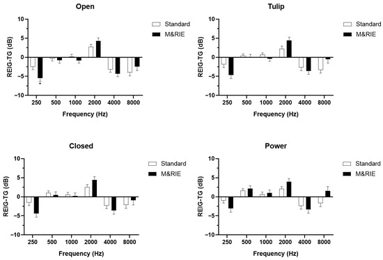 Figure 4 illustrates the comparison of REIG between the standard and M&RIE receivers across 69 ears. The analysis showed no significant differences in REIG values between the two receiver types, regardless of the earplug type, across all tested frequencies at a conversational level with 65 dB SPL input sound.