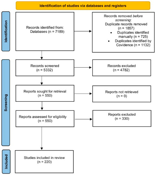 Our research strategy yielded 7189 articles, of which Covidence identified 1132 as duplicates, while 726 were identified manually. Only two-hundred-and-twenty articles were included in the final data extraction, as shown in the PRISMA flow diagram (Figure 1, Table S1).