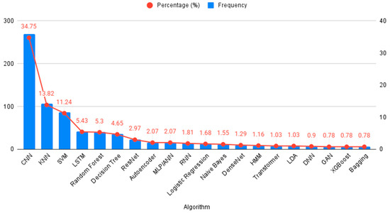 Figure 4 demonstrates the algorithms used in AI training. Some algorithms, such as CNN and SVM, were commonly used across multiple studies, while others, like the Cascade Correlation Neural Network, were used in only a few studies.
