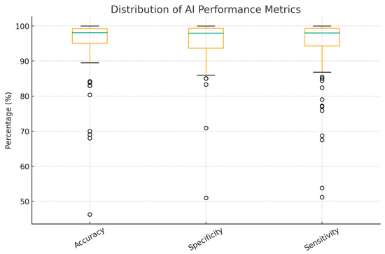 Accuracy, Sensitivity, and Specificity of AI Models Used in MI Detection Studies. Circles represent outliers.
